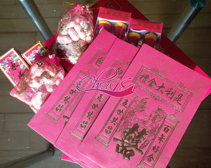• 10. 百年好盒:放有糠果、紅棗、花生、桂圓、蓮子、百合、扁柏、青縷兩對、紅頭繩、利是、及首飾